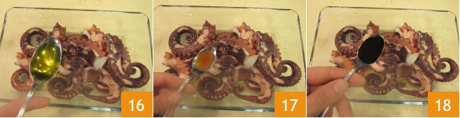 o azeite 16, o tabasco 17 e o molho de soja 18. Vire os tentáculos no tempero, cubra com filme plástico e deixe marinar por pelo menos 20 minutos.