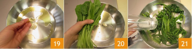 Enquanto isso, dedique-se ao restante das preparações: em uma frigideira grande, refogue em um fio de azeite um dente de alho com casca com uma pimenta seca esmigalhada 19, depois adicione as acelgas que você já terá limpado 20. Salteie por alguns minutos até que fiquem macias, depois ajuste o sal 21 e reserve.