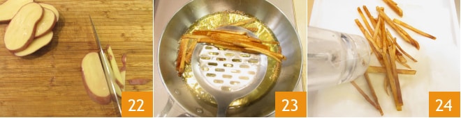 Lave as batatas com a casca e corte-as em palitos bem finos 22. Despeje o óleo vegetal em uma panela e aqueça até 150°C, depois frite algumas batatas de cada vez até dourar 23. Escorra em papel absorvente e salgue 24.