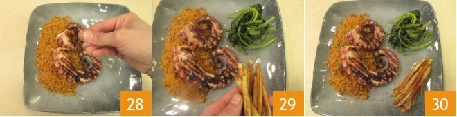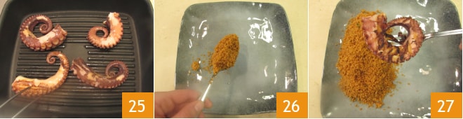 Agora você pode grelhar o polvo: aqueça bem uma grelha ou frigideira antiaderente e sele os tentáculos por alguns instantes de cada lado até formar uma crosta 25. Agora você está pronto para servir: coloque algumas colheres de cuscuz à páprica em um lado do prato 26 e coloque alguns tentáculos por pessoa 27.