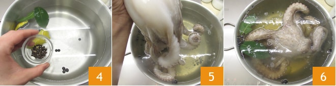 Encha uma panela alta e ampla com água, adicione as folhas de louro, a casca inteira de limão, as bagas de zimbro e os grãos de pimenta 4 e leve para ferver. Mergulhe os tentáculos do polvo 3 vezes na água fervente 5, depois mergulhe completamente o polvo inteiro e cozinhe em fogo médio-baixo por cerca de 45 minutos 6. Após esse tempo, desligue o fogo e deixe o polvo em sua água de cozimento por mais 15 minutos.