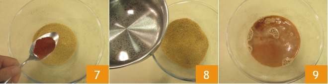 Enquanto o polvo cozinha, você pode se dedicar ao cuscuz: leve a água quase até ferver e despeje o cuscuz em uma tigela separada, adicione a páprica 7 e misture bem. Despeje a água fervente sobre o cuscuz até cobri-lo 8, depois misture novamente e deixe descansar por cerca de 6 minutos 9, cobrindo a tigela com uma tampa ou filme plástico.