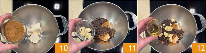 Agora, cuide do ganache: em uma tigela em banho-maria, misture o tofu sedoso, o açúcar mascavo integral 10, o chocolate picado, a manteiga de cacau 11 e o xarope de agave 12.
