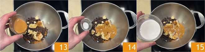 Adicione também a manteiga de amendoim 13, o sal 14 e o leite de coco 15.