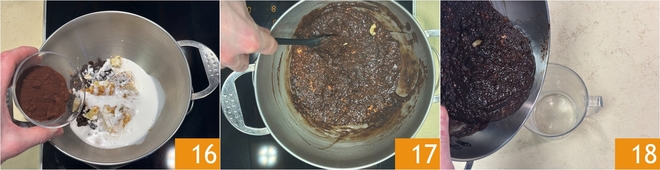 Complete com o cacau amargo 16, misture com cuidado e cozinhe por cerca de 10 minutos até que tudo esteja derretido 17. Transfira a mistura para uma jarra 18.