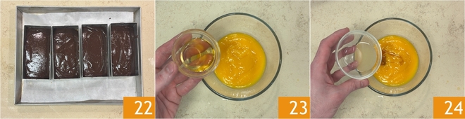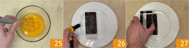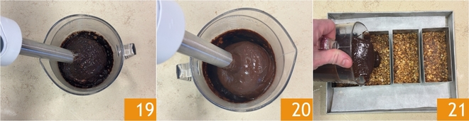 Emulsione com um mixer de imersão 19 para tornar o ganache liso e homogêneo 20. Despeje-o nas forminhas 21, depois bata a forma para nivelar e eliminar possíveis bolhas de ar.
