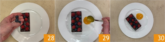 Decore com os mirtilos e framboesas frescas 28, adicione algumas folhinhas de endro e despeje o molho de manga ao lado 29. A terrina vegana de chocolate e amendoim com frutas vermelhas está pronta para ser servida 30!
