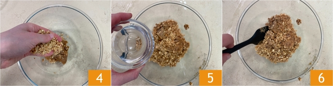 Adicione os amendoins à polpa triturada das tâmaras 4, em seguida, adicione também o óleo de coco 5 e misture tudo com uma espátula ou à mão 6.