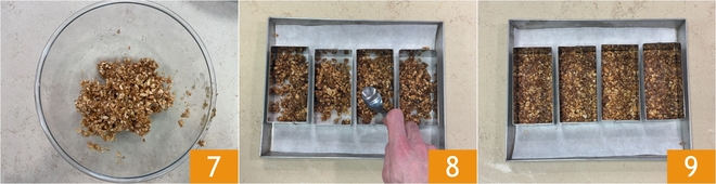 Uma vez obtida uma mistura homogênea 7, transfira-a para forminhas e uniformize a base pressionando bem com as costas de uma colher de chá 8. Coloque na geladeira por 15 minutos 9.