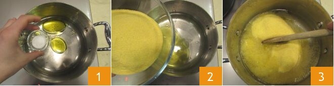 Para realizar o timbal de polenta e cotechino será necessário um cotechino já cozido; se não tiver um à disposição, pode prepará-lo seguindo nossas instruções na receita do cotechino com lentilhas. Cuide então da preparação da polenta: em uma panela de borda alta, coloque a água, junto com o óleo e o sal 1, e aqueça bem. Adicione a farinha na panela aos poucos 2 e misture bem com uma colher de pau para evitar a formação de grumos 3.