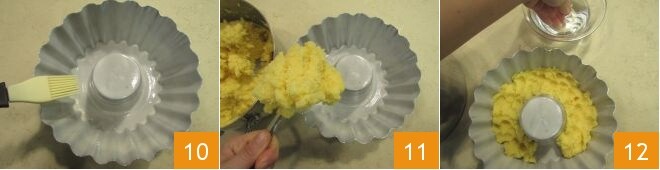 Unte uma forma de anel com diâmetro de 20 cm e altura de 8 cm, usando um pincel para untar bem toda a borda ondulada 10. Agora, coloque parte da polenta no fundo e nas bordas 11, pressionando com os dedos levemente umedecidos 12.