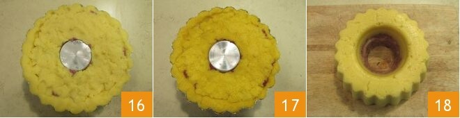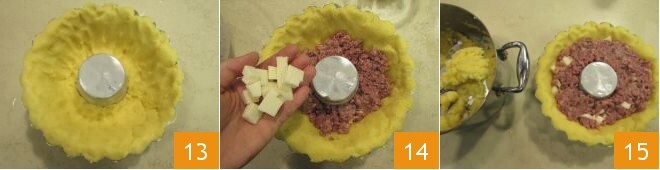 Depois de revestir toda a forma 13, recheie o interior com o cotechino e o queijo 14 e cubra com a polenta restante 15.