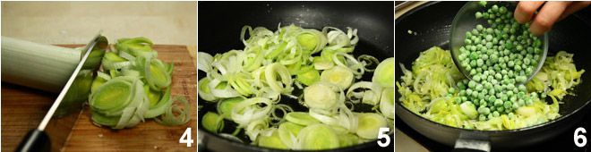 Fatie finamente o alho-poró 4 e coloque-o para refogar em uma panela larga antiaderente com óleo 5; deixe cozinhar suavemente por cerca de 10-15 minutos, depois adicione as ervilhas 6 e deixe cozinhar até que estejam bem macias, cerca de 15 minutos; se necessário, adicione caldo de legumes quente ou água quente durante o cozimento.