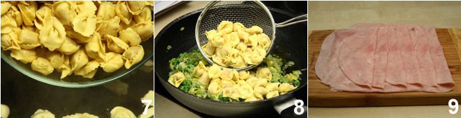 Leve ao fogo uma quantidade abundante de água salgada e adicione os tortellini (você também pode fazê-los seguindo a receita do site: tortellini) 7, cozinhe pelo tempo indicado na embalagem; geralmente 1 ou 2 minutos.
