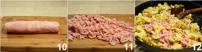 Escorra-os muito bem, tomando cuidado para não quebrá-los, e adicione-os à panela com as ervilhas e o alho-poró 8. Disponha sobre uma tábua o presunto cozido 9