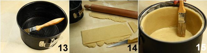 Forre a forma redonda com fundo removível com a tira retangular que você untou com manteiga com um pincel, faça a massa aderir bem à forma, cubra o fundo com um dos dois discos 15