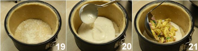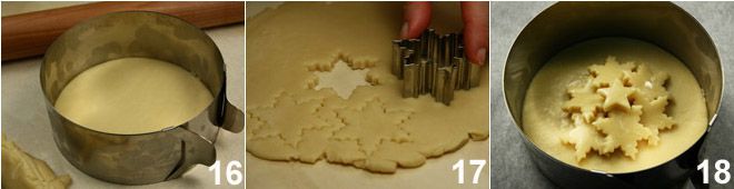 Deixe o disco de base em uma forma com fundo removível ajustável 16 (isso serve para garantir que durante o assamento não se alargue, mas mantenha sua forma), pincele-o com um ovo e da massa brisée restante recorte formas 17 com cortadores de biscoito e disponha-as sobre o disco 18 que servirá como "tampa" superior.