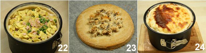 Retire do forno o disco-tampa 23 e o timbale de tortellini 24, deixe esfriar e depois abra a forma com fundo removível, tomando muito cuidado para não quebrar o seu timbale de tortellini. Coloque em um prato de servir e decore com o disco-tampa. Agora o seu timbale de tortellini está pronto para tornar única a sua mesa de festas!