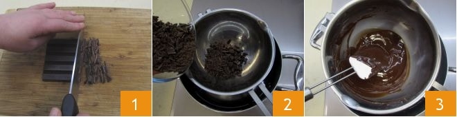 Para preparar o tiramisù de chocolate, comece derretendo o chocolate amargo: pique-o 1, então derreta-o em banho-maria, evitando que a água entre em contato com o chocolate 2 (alternativamente, você pode derretê-lo no micro-ondas em várias etapas, colocando-o por 2-3 minutos, depois mexendo e colocando novamente no micro-ondas para derretê-lo de maneira controlada). Mexa para derreter 3 e, uma vez pronto, transfira para uma tigelinha e deixe esfriar.
