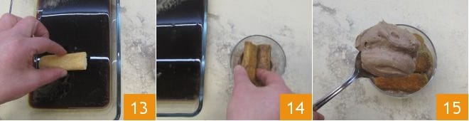 Divida cada biscoito champagne ao meio e mergulhe no café de ambos os lados 13, depois coloque duas metades na base do copo 14 e despeje o creme de mascarpone com chocolate 15; para criar as camadas de creme, você também pode usar uma manga de confeitar descartável. Continue polvilhando com cacau em pó, depois continue com outra camada de biscoitos umedecidos com café e uma de creme.