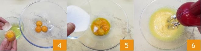 Enquanto isso, separe as gemas das claras 4 e adicione o açúcar às gemas 5, em seguida, bata com uma batedeira elétrica para criar uma mistura espumosa e clara 6. Com as claras restantes, você pode preparar deliciosos suspiros ou biscoitos língua de gato.