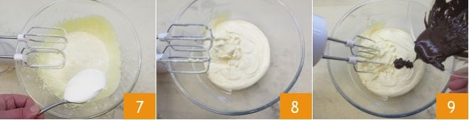 Trabalhe o mascarpone com as batedeiras, então adicione-o à mistura de ovos e açúcar que você montou 7, mexa novamente com as batedeiras para obter um creme denso 8. Quando o chocolate estiver morno, adicione-o ao creme 9.