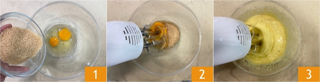 Para preparar o tiramisù com iogurte grego, comece pela pasta biscuit: em uma tigela, coloque o açúcar e os ovos 1, depois bata com batedeira elétrica por cerca de dez minutos 2 ou até que a mistura esteja clara e espumosa 3.