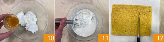 Enquanto isso, dedique-se ao creme de iogurte: em uma tigela, coloque o iogurte grego e o mel 10, depois misture bem com um batedor 11. Pegue a pasta biscuit e corte em retângulos do mesmo tamanho da travessa onde você irá montar o seu tiramisù (a nossa mede 22x17 cm) 12.