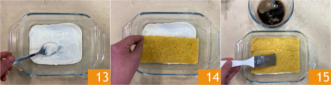 Distribua um pouco de creme de iogurte no fundo 13, depois coloque a pasta biscuit 14 e umedeça com o café frio 15.