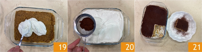 Finalize com o restante do creme de iogurte grego 19, nivele bem, depois polvilhe com cacau em pó peneirado 20. Deixe seu tiramisù com iogurte grego descansar na geladeira por pelo menos 2 horas antes de servir 21!