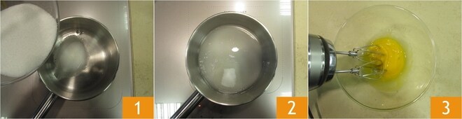 Para preparar o tiramisù com ovos pasteurizados, comece pela pâte à bombe. Em uma panelinha, coloque a água e o açúcar 1. Aqueça em fogo baixo sem mexer 2 e cozinhe a calda até atingir a temperatura de 121º; use um termômetro de cozinha para medir a temperatura exata. Quando atingir 115º, comece a bater as gemas com uma batedeira elétrica em uma tigela separada 3.