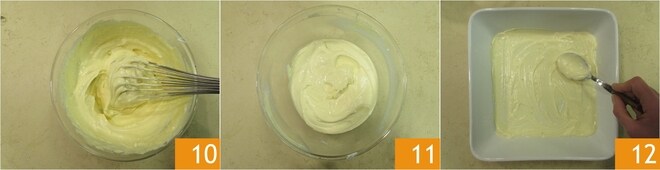 Você deve obter um creme uniforme e firme 10. Coloque na geladeira, enquanto isso, prepare o café e deixe esfriar 11. Agora, pegue uma travessa quadrada de 20 cm na base e 24 cm na superfície. Espalhe uma camada de creme de mascarpone no fundo 12.