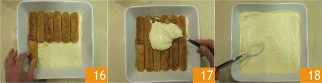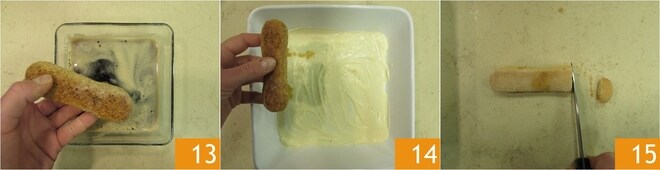 Molhe rapidamente os biscoitos champanhe no café frio, um de cada vez 13. Coloque-os dentro da travessa 14 para completar a primeira fileira; você precisará de 14. Corte-os levemente se necessário 15, assim você não terá dificuldade em encaixá-los na travessa.