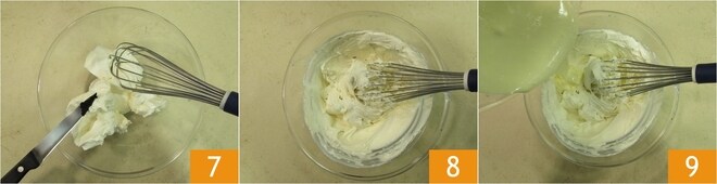 Coloque o mascarpone em uma tigela, adicione as sementes da vagem de baunilha 7 e mexa com um batedor para amolecer 8. Adicione também a pâte à bombe e misture novamente com o batedor 9.