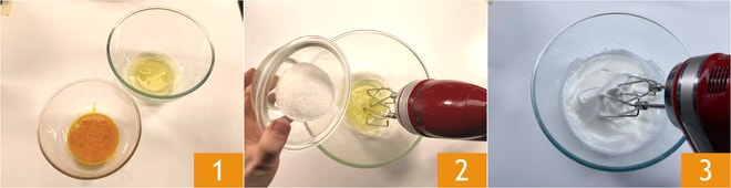 Para preparar o tiramisù de pandoro, prepare o creme de mascarpone: separe cuidadosamente as gemas das claras 1: comece a bater essas últimas com uma batedeira e, aos poucos, incorpore 60 g de açúcar 2 e bata quase até o ponto de neve 3.