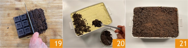 Pique o chocolate 19 e cubra a superfície apenas com isso 20 ou com cacau e chocolate a gosto 21. Deixe firmar uma hora na geladeira o tiramisù de pandoro antes de servir.
