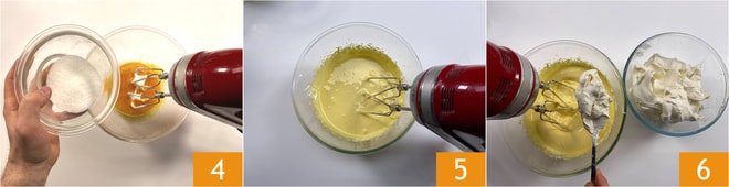 Com a mesma batedeira, comece a bater as gemas, depois adicione aos poucos os outros 60 g de açúcar 4 até obter uma mistura clara 5. Em seguida, adicione o mascarpone um pouco de cada vez ainda com a batedeira elétrica. Uma vez incorporado tudo, misture o creme com cerca de metade das claras em neve 6. Aqui você pode misturar com uma espátula até mesmo rapidamente.