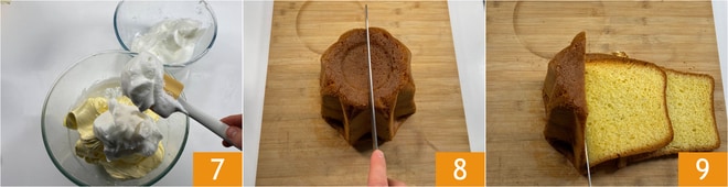 Depois, incorpore delicadamente a parte restante, mexendo com movimentos de cima para baixo 7. Divida o pandoro ao meio 8 e corte fatias de cerca de 1 cm de espessura 9.