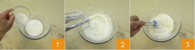 Para preparar o tiramisù floresta negra, comece pelo creme. Em uma tigela, coloque o creme de leite frio de geladeira, adicione o açúcar 1 e ligue as batedeiras primeiro em velocidade média e depois um pouco mais alta. Assim, ele ficará perfeitamente em ponto de neve 2. Em seguida, trabalhe o mascarpone com uma espátula por alguns instantes, assim você o amolece 3.