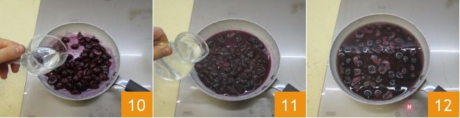 Assim que notar o suco saindo das cerejas, adicione o licor: tenha muito cuidado com possíveis chamas de retorno 10. Quando o álcool evaporar, adicione a água 11 e leve para ferver, em seguida, desligue 12.