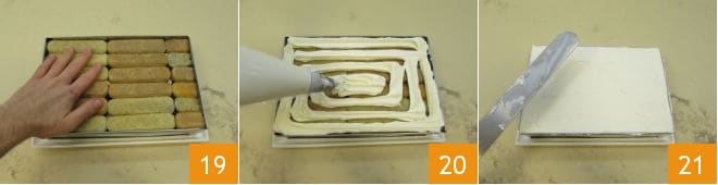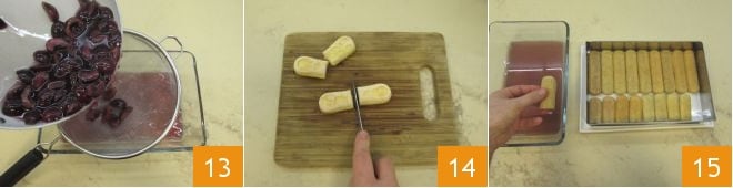 Em uma peneira, coloque as cerejas e recolha o suco quente, deixando-o esfriar por alguns instantes 13. Enquanto isso, certifique-se de que os biscoitos champanhe caibam perfeitamente na moldura ajustável de 25x17cm e disposta em um prato (alternativamente, uma forma retangular também serve), então modele uma parte dos biscoitos para que não tenham dificuldade em entrar 14. Comece a molhar os biscoitos champanhe um por um, tomando cuidado para não encharcá-los demais e distribua por todo o perímetro 15.