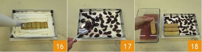 Na base, forme uma camada de creme 16 e polvilhe com as cerejas refogadas 17. Finalmente, faça outra camada de biscoitos champanhe molhando-os no restante líquido morno, mas desta vez dispondo-os em sentido oposto ao inicial 18.