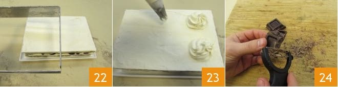 Retire a moldura 22 e passe para a decoração. Retire o creme da geladeira e esprema 6 montinhos distanciados entre si, para ajudar, imagine dividir a sobremesa em 6 porções 23. Rale com um descascador de batatas o chocolate 24