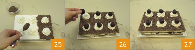 e polvilhe a parte sem montinhos com as raspas 25. Finalmente, decore os montinhos com cerejas frescas 26. E aqui está o seu delicioso e cenográfico tiramisù floresta negra 27 pronto!