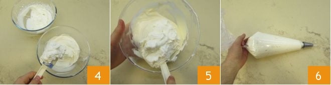 Adicione o chantilly aos poucos 4. Assim, com a primeira colherada você pode misturar o mascarpone e o restante pode ser incorporado com mais delicadeza 5. Uma vez misturado, coloque em um saco de confeitar com bico de flor e deixe descansar na geladeira por pelo menos 30 minutos 6.