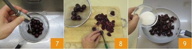 Enquanto isso, cuide das cerejas. Lave-as brevemente e seque-as 7, em seguida corte-as em 4 partes removendo o cabinho e o caroço 8. Coloque em uma frigideira antiaderente junto com o açúcar, acenda o fogão em temperatura média e deixe aquecer por alguns minutos 9.