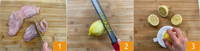 Para preparar as tiras de frango ao limão, corte o peito de frango em tiras 1, eliminando qualquer parte gordurosa. Rale a casca do limão 2 e esprema o suco, coando-o 3.