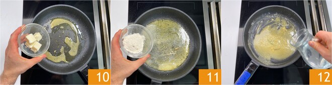Abaixe o fogo e, na mesma panela, derreta a manteiga 10. Adicione a farinha 11 e mexa com um batedor, em seguida, adicione a água 12.