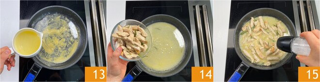 Adicione também o suco de limão 13 e deixe engrossar um pouco (menos de 1 minuto ou o tempo necessário). Mergulhe o frango 14 para pegar o sabor e adicione sal 15.