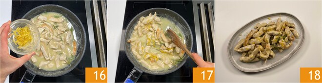 Aromatize com a casca de limão 16, misture 17 e sirva bem quente as tiras de frango ao limão 18.